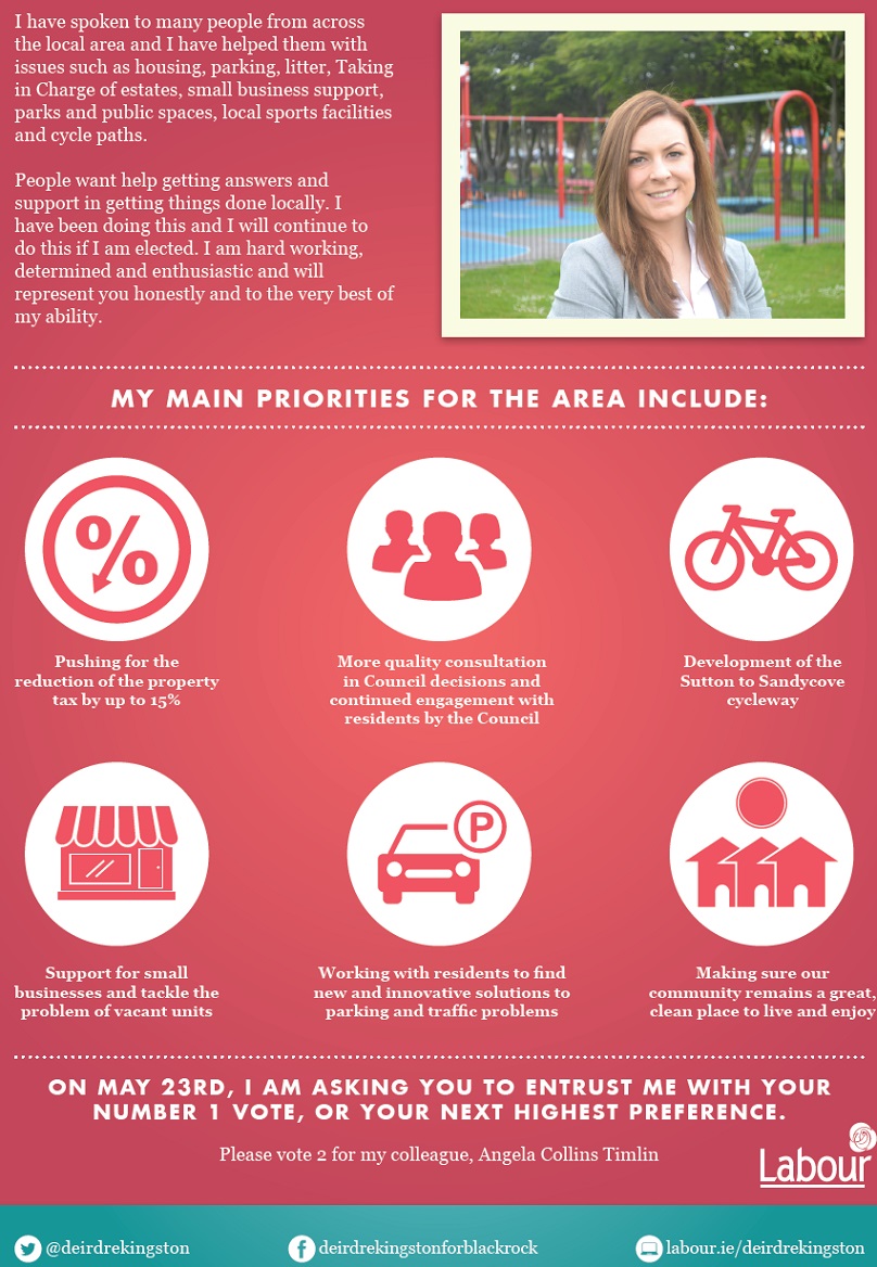 A final pre election leaflet from Deirdre Kingston who is running for Labour in Blackrock for a seat on Dun Laoghaire Rathdown County Council.