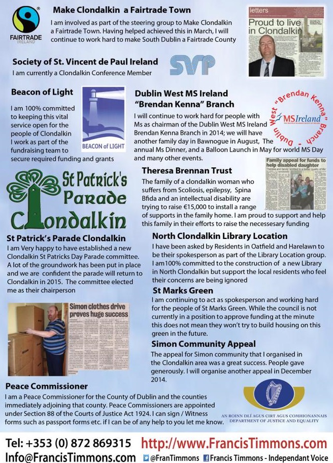 Leaflet from Francis Timmons -Independent – Clondalkin -2014 Local Elections » ftimmons2