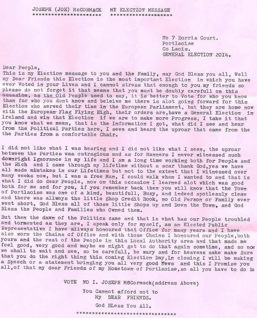 Letter to Voters from Joseph (Joe) McCormack -Independent -Portlaoise » jmccormack