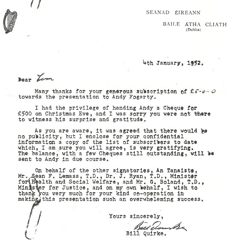 1952 Letter from Bill Quirke (FF General Secretary) listing subscriptions towards a presentation to former TD Andy Fogarty » afogarty1