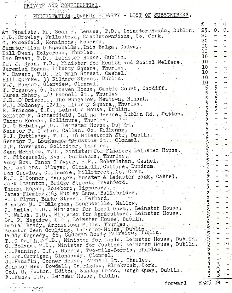 1952 Letter from Bill Quirke (FF General Secretary) listing subscriptions towards a presentation to former TD Andy Fogarty » afogarty2