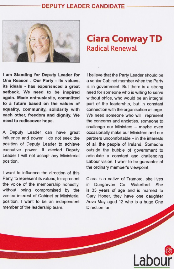 Leaflets from Ciara Conway, Alan Kelly, Michael McCarthy and Sean Sherlock- Labour Deputy Leadership contest » cconway