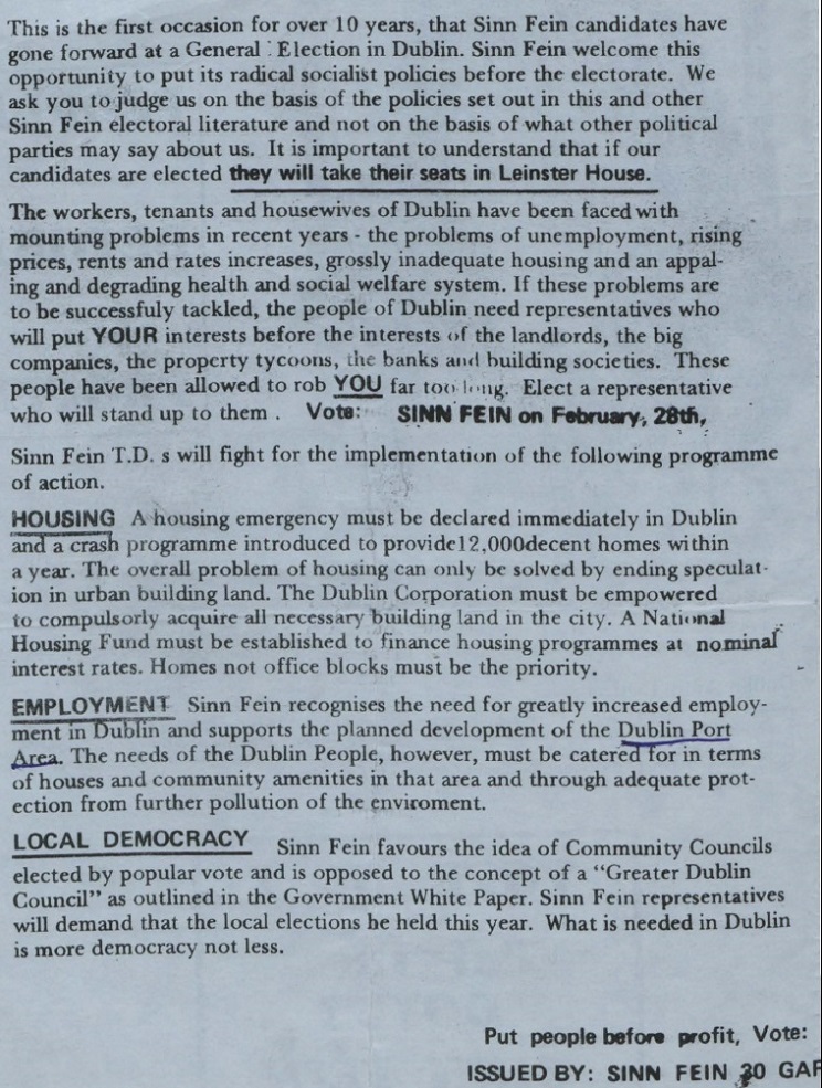 From the 1973 General Election a leaflet from Peigin Doyle who was running for Official Sinn Fein in Dublin South Central. She polled 1521 votes and missed out on a seat. She also stood in the 1974 Local Elections in Pembroke/Rathmines polling 962 votes and also missing out on a seat.