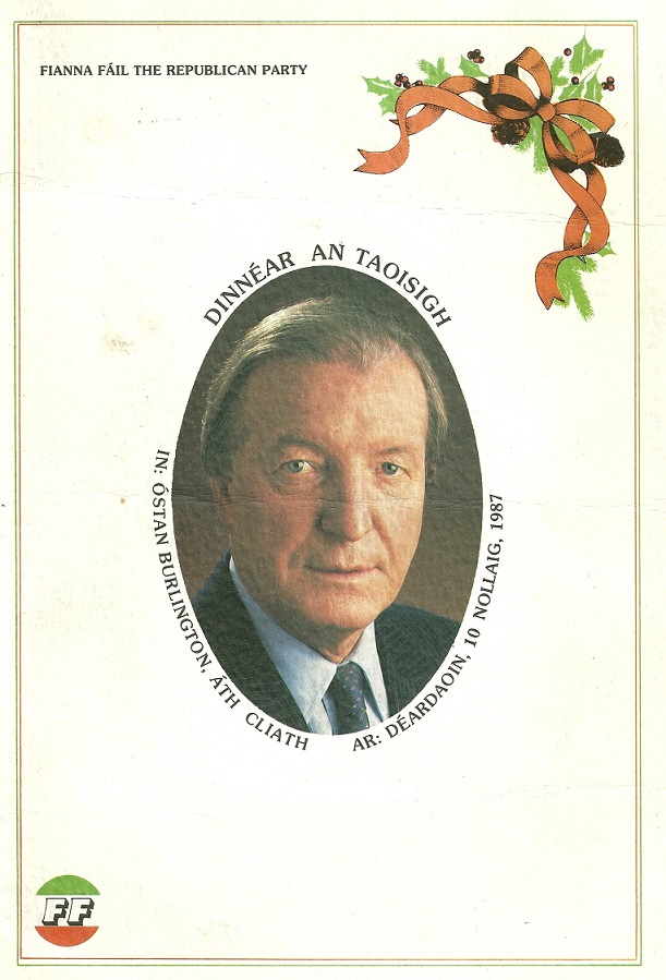 Programme for the 1987 Fianna Fail ‘Dinnéar An Taoisigh’ with Prizes, Menu and Cigars » dinner87a