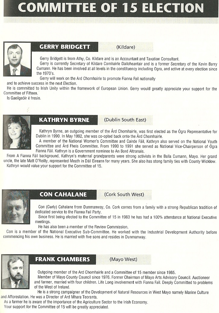 Profiles of candidates for Honorary Treasurer and Committee of 15 elections from the 1993 Fianna Fail Ard Fheis » 93co15a