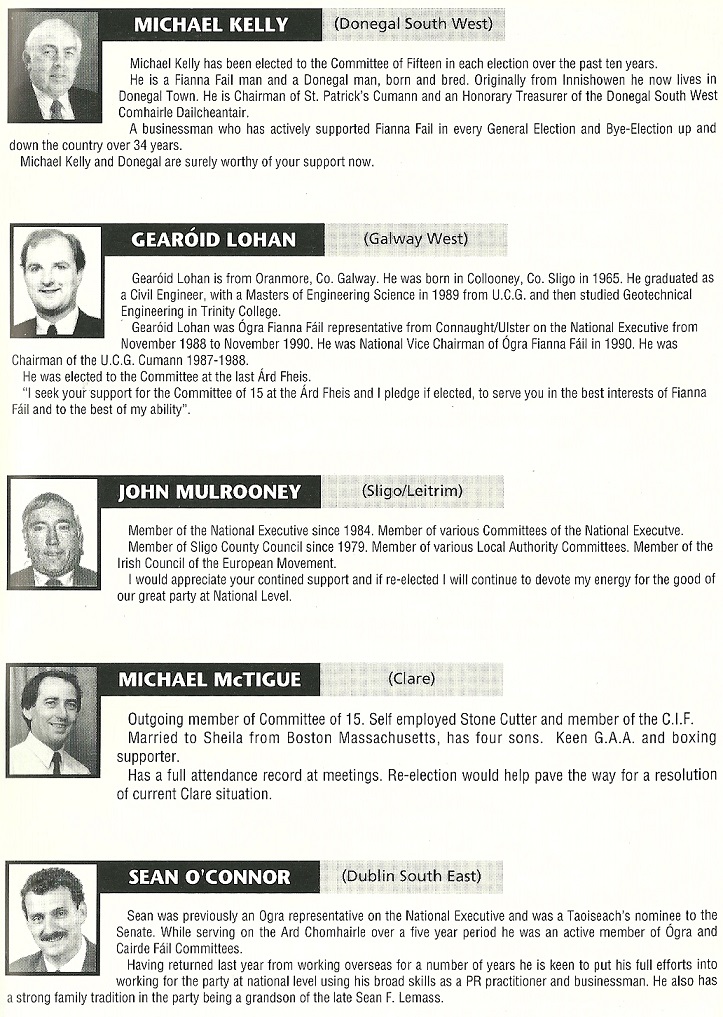 Profiles of candidates for Honorary Treasurer and Committee of 15 elections from the 1993 Fianna Fail Ard Fheis » 93co15c