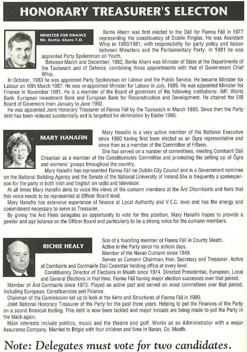 Profiles of candidates for Honorary Treasurer and Committee of 15 elections from the 1993 Fianna Fail Ard Fheis » 93htff