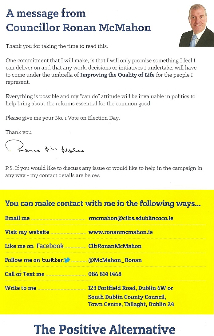Leaflet and Dog Coat from Ronan McMahon -Independent -2014 Dublin South West By-Election » rmcmahondsw4