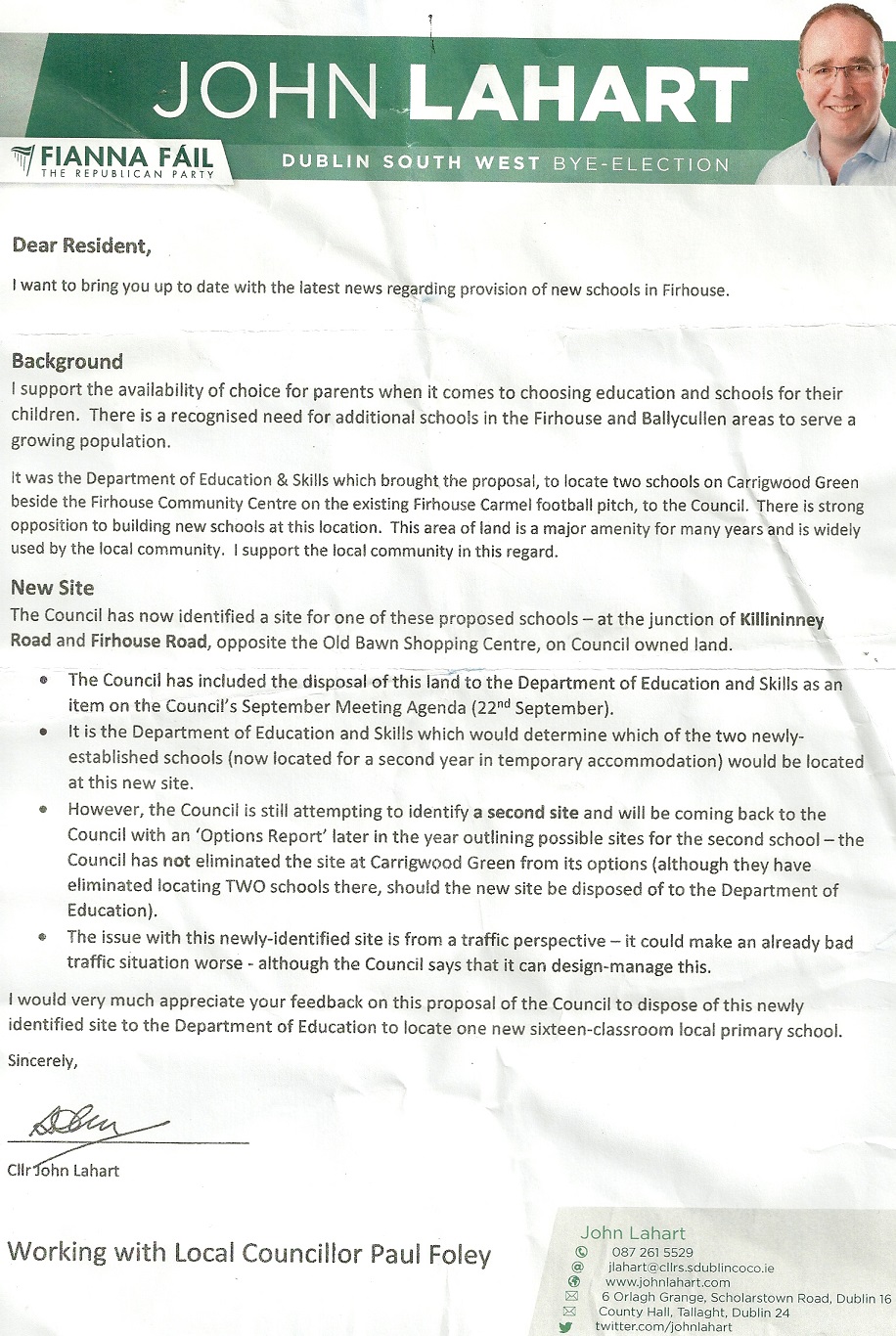 A number of canvass cards as well as a letter to voters regarding a new School in Firhouse from Fianna Fail Dublin South West By Election candidate John Lahart.