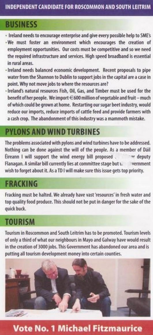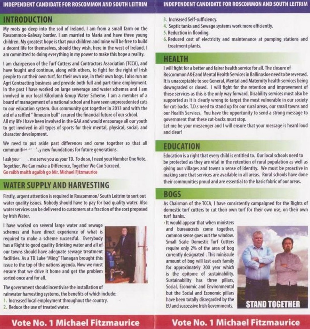 “Standing With The People” a Leaflet from Michael Fitzmaurice who is running as an Independent in the 2014 Roscommon South Leitrim By Election. He is backed by Luke ‘Ming’ Flanagan and is president of the Turf Cutters and Contractors Association.