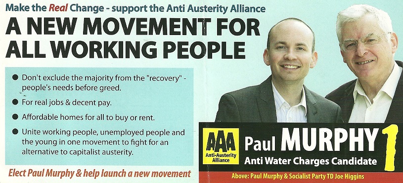 A flyer from Paul Murphy who ran for the Anti Austerity Alliance in the 2014 Dublin South West By Election. Murphy won the seat.