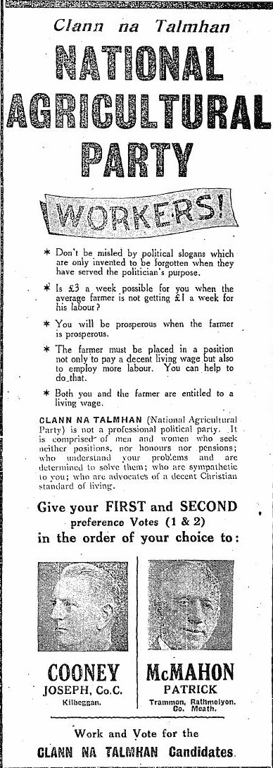Leaflet from Joseph Cooney , Patrick McMahon -Clann na Talmhan -Meath Westmeath -1943 General Election » clannantal43