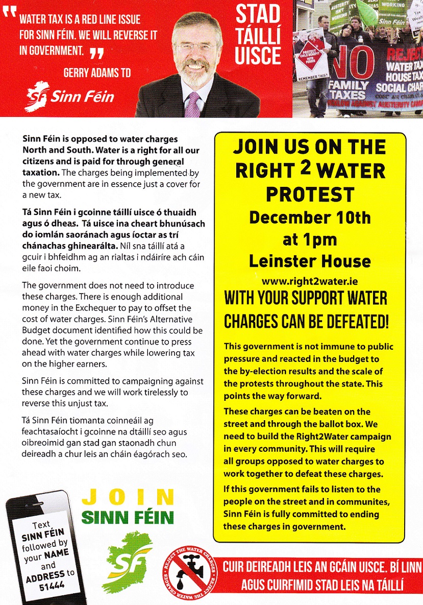 A “We Reject Water Charges” leaflet from Sinn Fein outlining their opposition to them and with a pledge to “Reverse it in Government”. The Leaflet also mentions the Right2Water protest on the 10th of December.