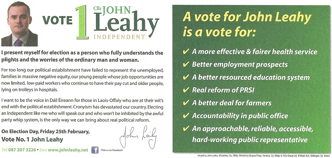 A leaflet from Offaly based Independent Councillor John Leahy from the 2011 General Election. He polled 4,882 votes. He polled 2686 votes in The Local Elections topping the poll in Birr.