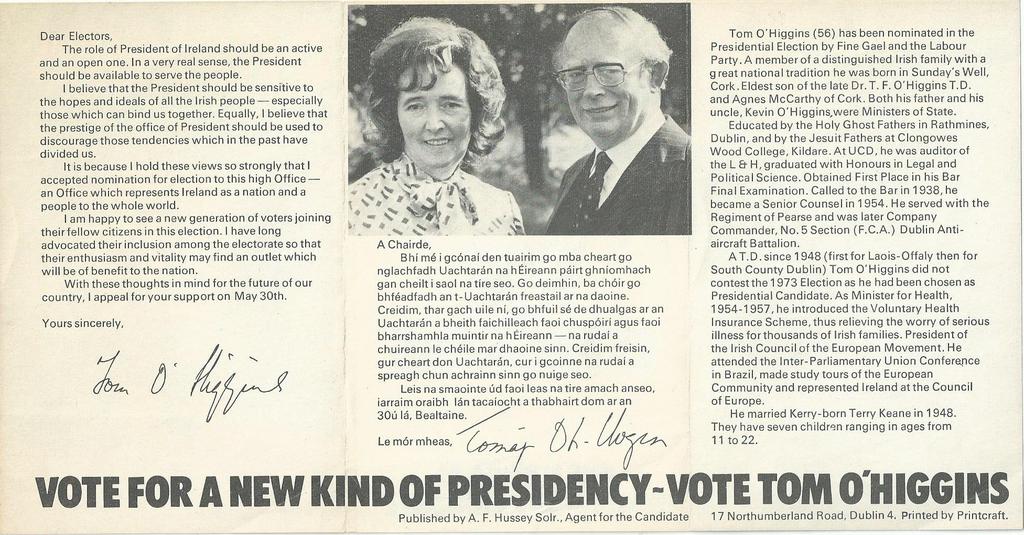 From the 1973 Presidential Election a leaflet from former Fine Gael TD Tom O’ Higgins who was running as The National Coalition Candidate. He was defeated by Fianna Fail candidate Erskine Childers.