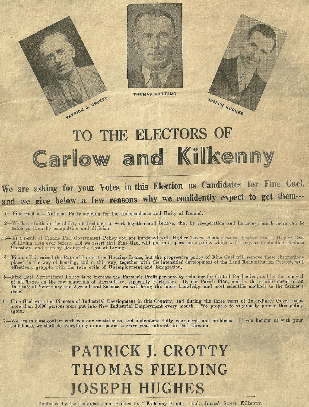 1954 General Election leaflet from Patrick Crotty, Joseph Hughes, Thomas Fielding -Fine Gael Carlow Kilkenny » ckfg54