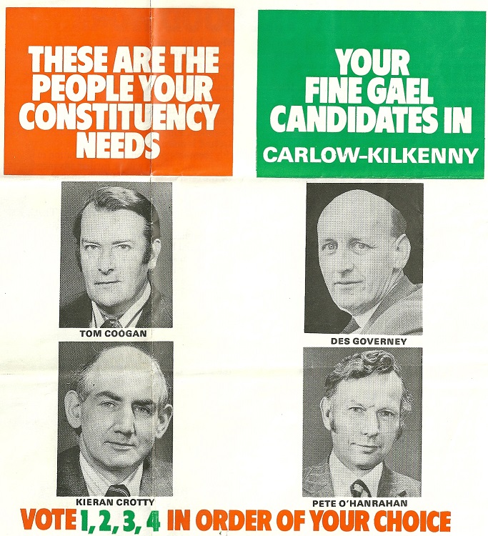 Leaflet for Tom Coogan, Kieran Crotty, Des Governey, Pete O’Hanrahan -Fine Gael -Carlow Kilkenny 1977 General Election » ck77fg2