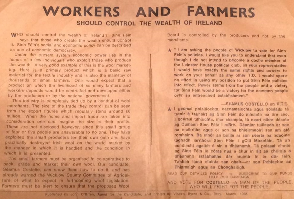 1. The leaflet is from the 1968 Wicklow by-election Seamus Costello got 2,009 votes.