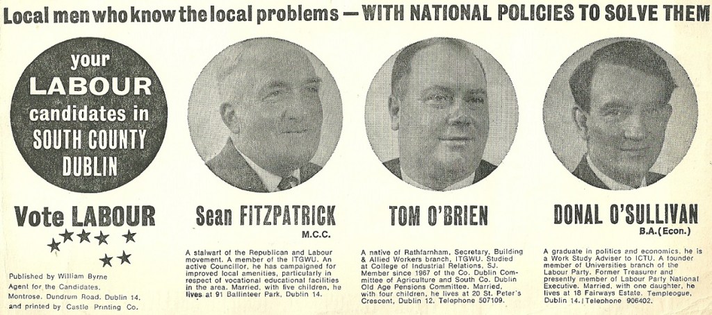 Leaflet from Sean Fitzpatrick, Tom O’Brien, Donal O’Sullivan -Labour – Dublin County South- 1969 General Election » dsthc69a