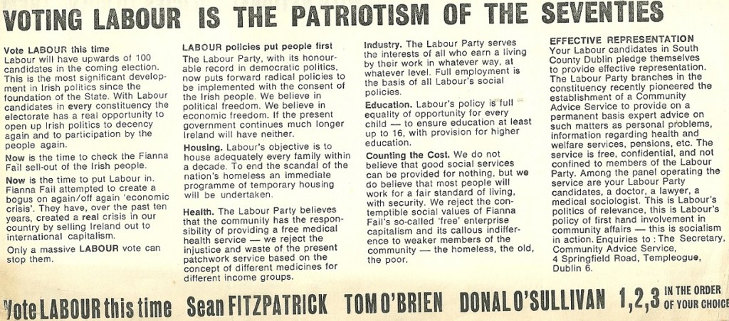 Leaflet from Sean Fitzpatrick, Tom O’Brien, Donal O’Sullivan -Labour – Dublin County South- 1969 General Election » dsthc69b