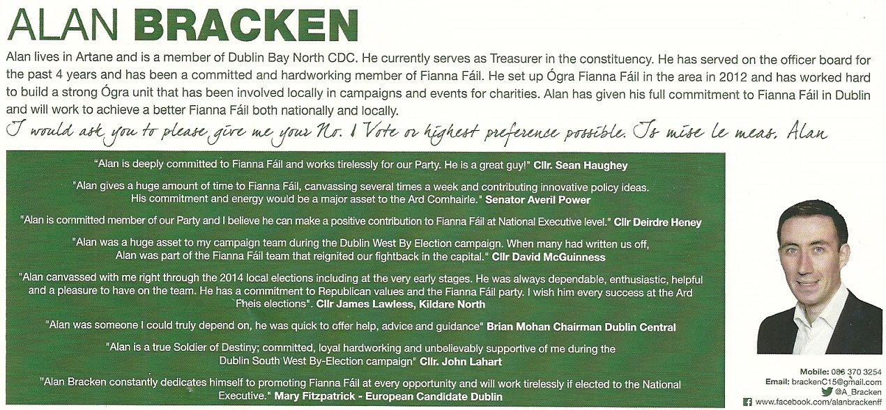 A Leaflet from Dublin Bay North based Alan Bracken who is running for the Fianna Fail Committee of 15 at the 2015 Fianna Fail Ard Fheis. Many Thanks to the sender.