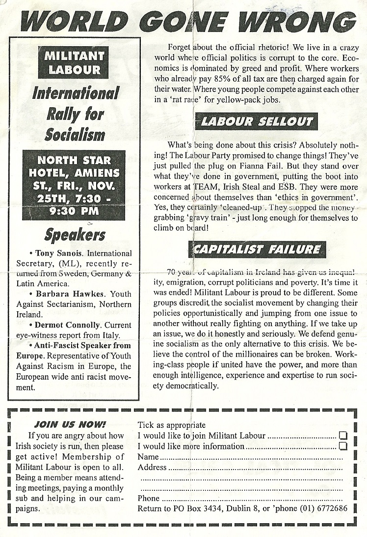 From November 1994 a leaflet from Militant Labour covering some of the issues of the time as well as advertising a number of public meetings.