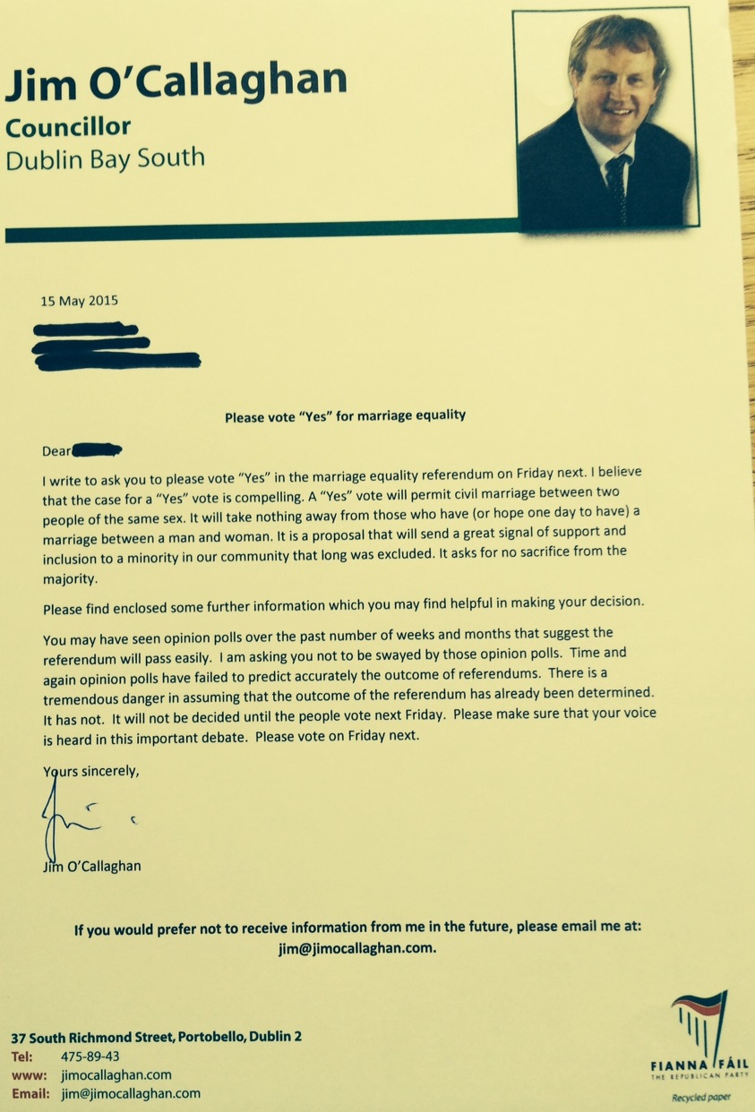 Letter to voters asking for Yes Vote in The Marriage Equality Referendum from Jim O’Callaghan -Fianna Fail -Dublin Bay South » jimocallletter