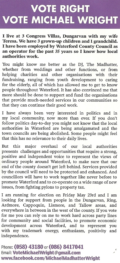 “Make Your Vote Matter Vote For The Hatter” leaflet from Michael ‘Madhatter’ Wright -Independent -Dungarvan Lismore -2014 Local Elections » madhatter2