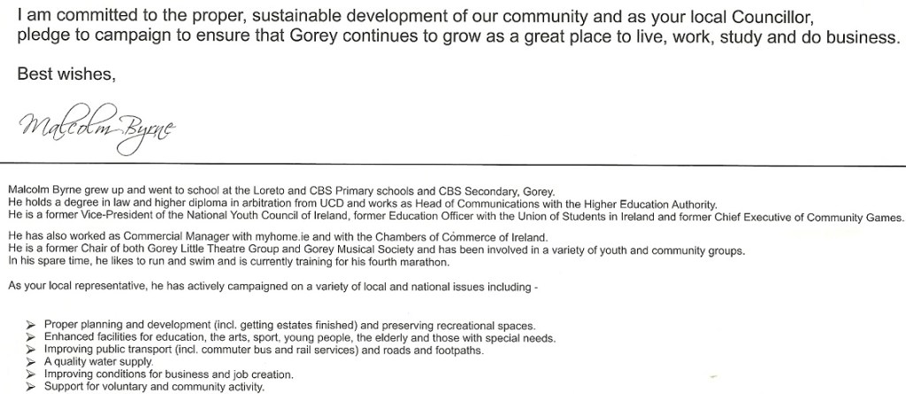 Leaflet from Malcolm Byrne – Fianna Fail -2009 Local Elections -Gorey » mbyrne2