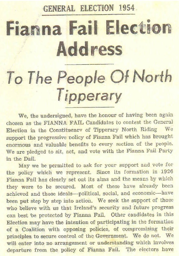 Leaflet from Mary Bridget Ryan and John Fanning – Fianna Fail – Tipperary North -1954 General Election » 54ge1a