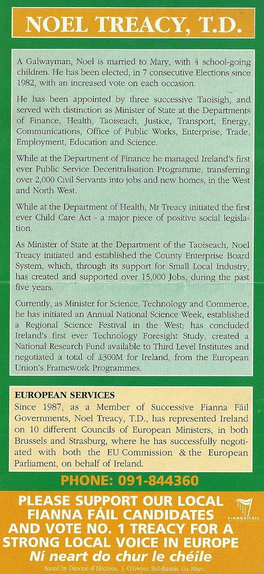 Leaflet from Noel Treacy – Fianna Fail -1999 European Elections -Connaught Ulster » ntreacy99b