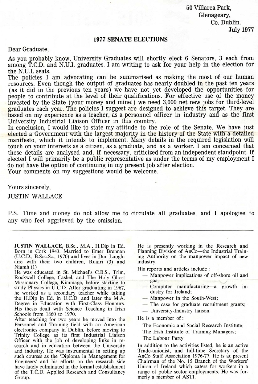 Leaflet from Justin Wallace -Independent – 1977 NUI Seanad Election » JW back