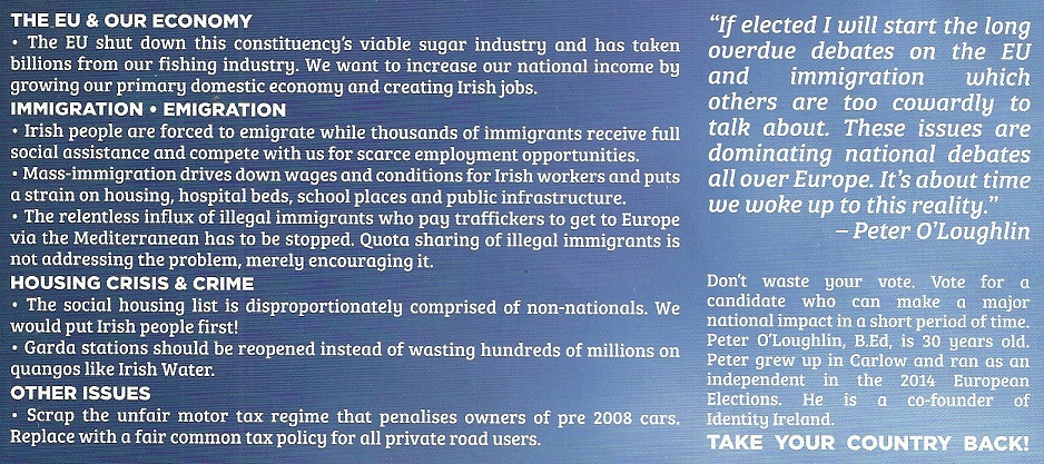 A Leaflet from Peter O’Loughlin who ran for Identity Ireland in the 2015 Carlow Kilkenny Bye Election. He polled 930 votes.