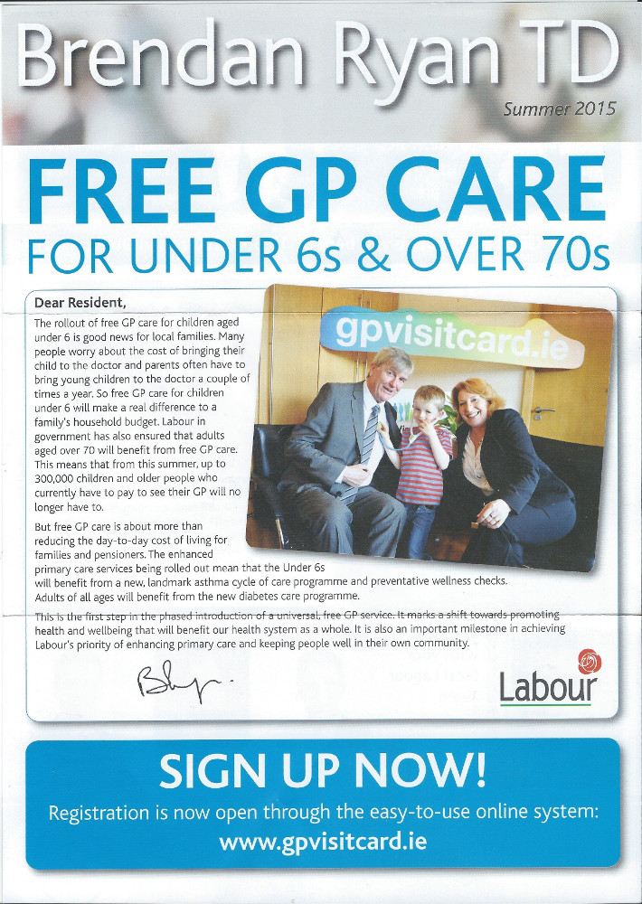 “Free GP Care for Under 6s and Over 70s” leaflet from Brendan Ryan -Labour -Dublin Fingal » BR-1