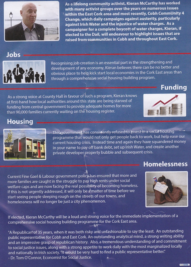 A leaflet from former Sinn Fein Councillor Kieran McCarthy who is running as an Independent in Cork East at the next General Election. The Cobh based Councillor was a member of Cobh Town Council from 1994 until its abolition in 2014.