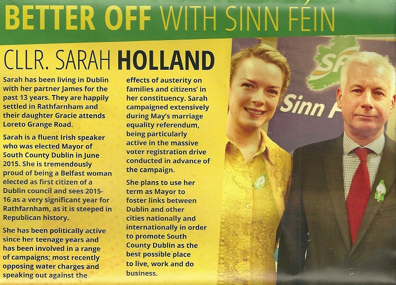 A leaflet from Cllr Sarah Holland who is running for Sinn Fein, alongside Sean Crowe , in Dublin South West.