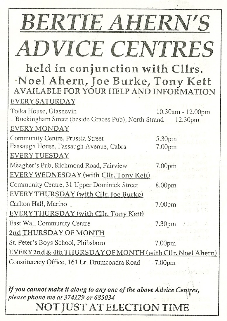 A leaflet announcing that Bertie Ahern in conjunction with Cllr Joe Burke would be in your area on his ‘Annual Walkabout’. The leaflet also has details of Bertie Aherns Advice Centres.
