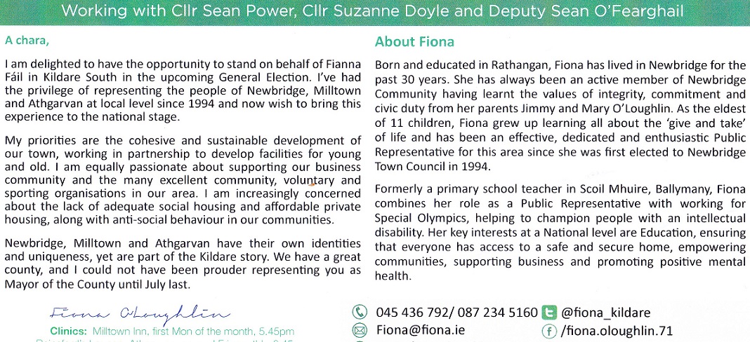 A leaflet from Newbridge based Fiona O’Loughlin who was recently chosen to run for Fianna Fail in Kildare South.