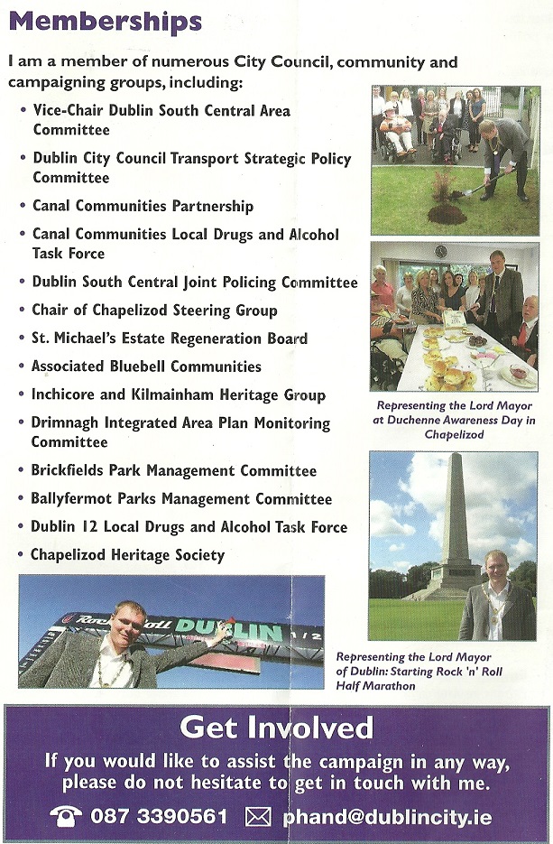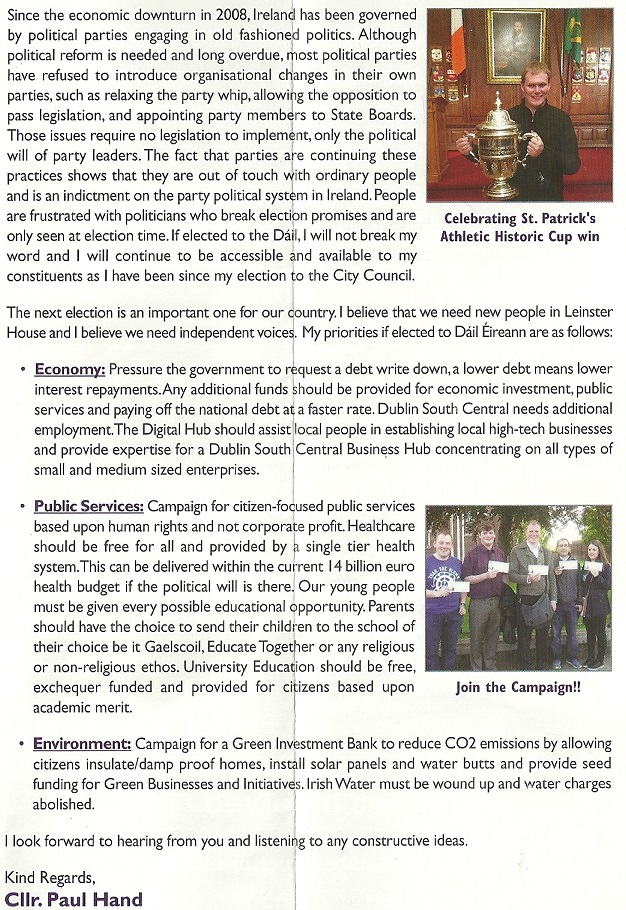 A leaflet from Independent Councillor Paul Hand, who is running in Dublin South Central. The leaflet features the once rare sight of a Pats fan (Paul Hand) holding the FAI Cup.
