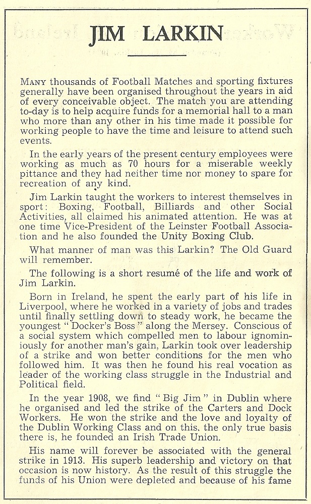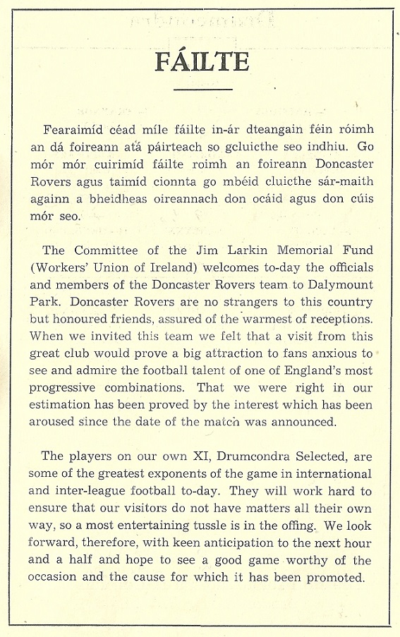 The Souvenir Programme for the Jim Larkin Memorial Fund match between Drumcondra and Doncaster Rovers held in Dalymount Park held on the 9th of May 1952. The programme has a piece on Larkin , The Workers Union of Ireland, and the Memorial fund which aimed to Build a Jim Larkin Memorial Hall. The game was started by Oscar Traynor and it was quite an impressive Drumcondra line up.