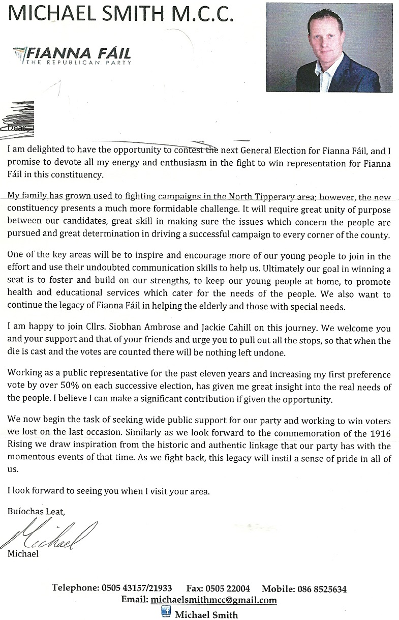 Letter to voters from Michael Smith -Fianna Fail -Tipperary » msmithletter