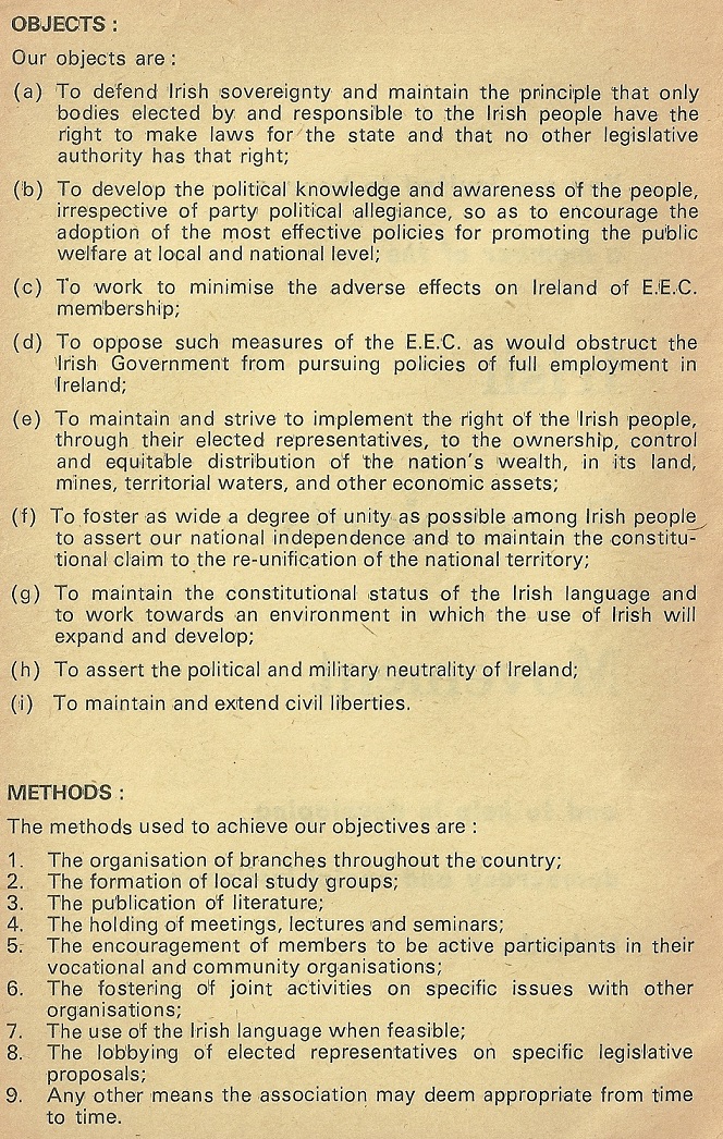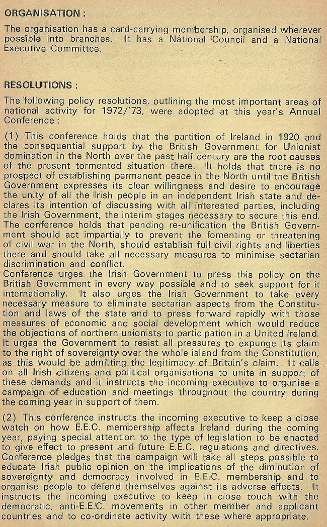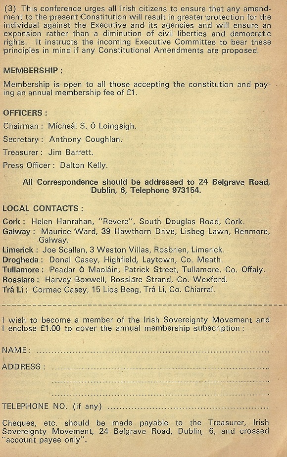 A membership form for the Irish Sovereignty Movement which was a political lobby group in the 1970s and 1980s among those involved was Anthony Coughlan. Aside from a membership application, the leaflet contains it’s policy resolutions, objectives and the methods to achieve the objectives.