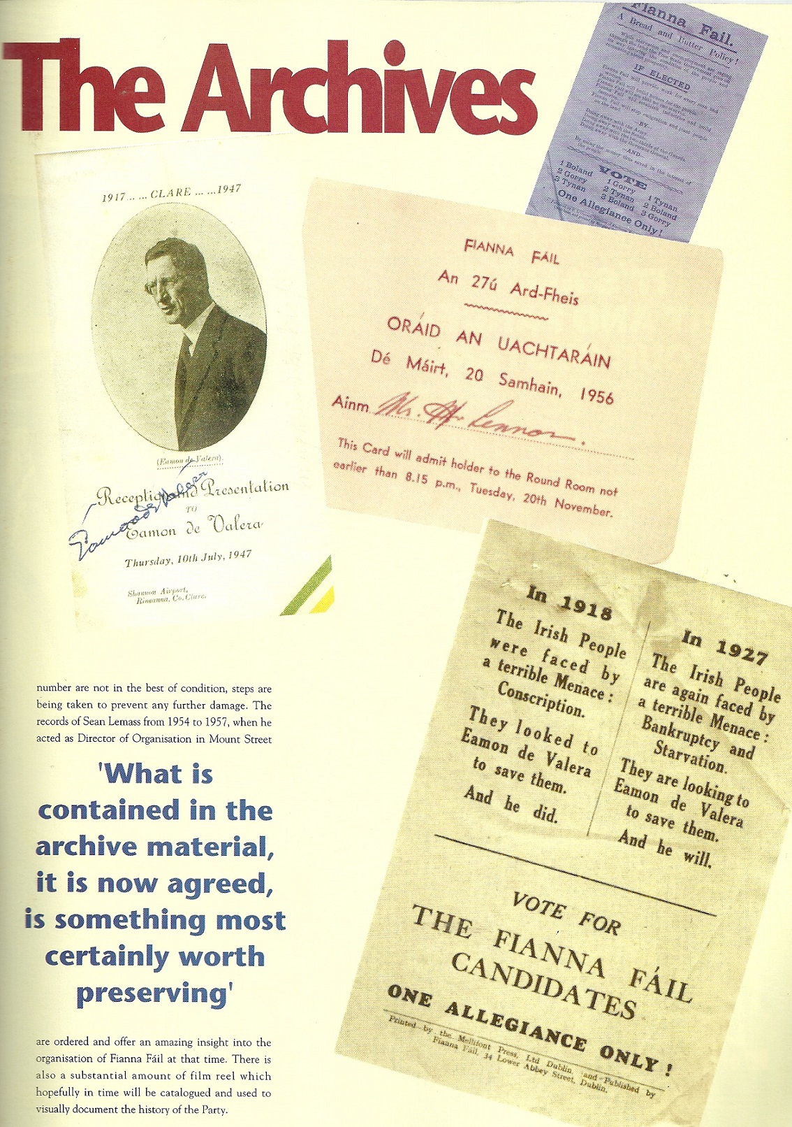 A piece on The Fianna Fail archives from a 1993 publication “Ceiliúradh an 60ú Árd Fheis” which was a special programme for the 60th Ard Fheis which contained some fantastic pieces on the history of the party, its TD’s ,Ministers and much more.