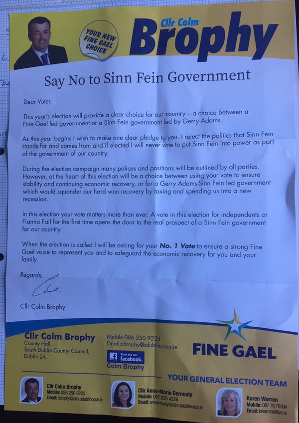 “Say No to Sinn Fein Government” leaflet from Colm Brophy -Fine Gael-Dublin South West #GE16 » NotoSFFG