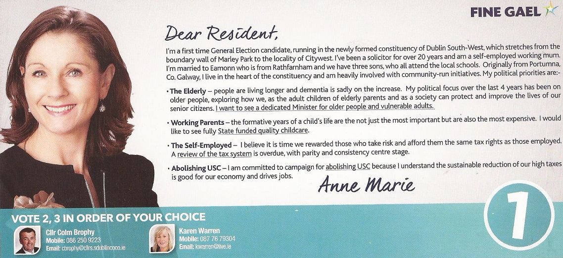 A Canvass Card from Fine Gael Councillor Anne-Marie Dermody who is running in Dublin South West. Nice to see Shamrock Rovers playing in the background !!