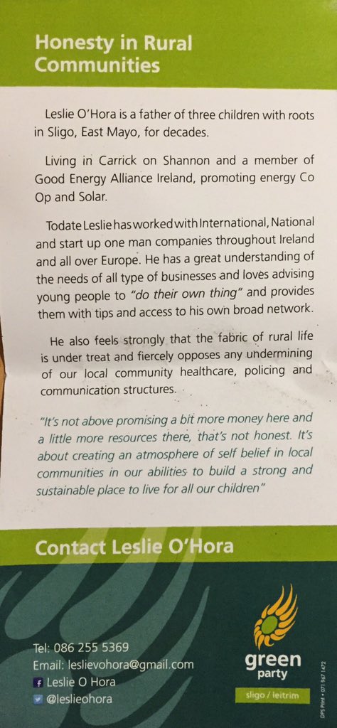 A Leaflet from Leslie O’Hora who is running for The Green Party in Sligo Leitrim.