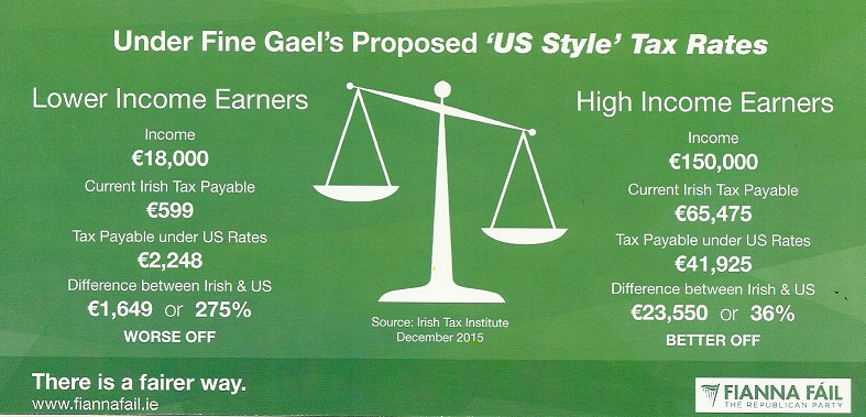 A Fianna Fail flyer against “Fine Gael’s proposed US style Tax Rates” with the message that Fianna Fails tax proposals are fairer on the reverse.