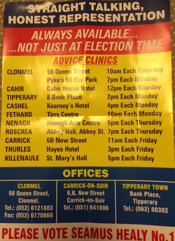 A leaflet from Clonmel based TD Seamus Healy who is running in Tipperary for The Workers and Unemployed Group. He is also running under the Right2Change platform.
