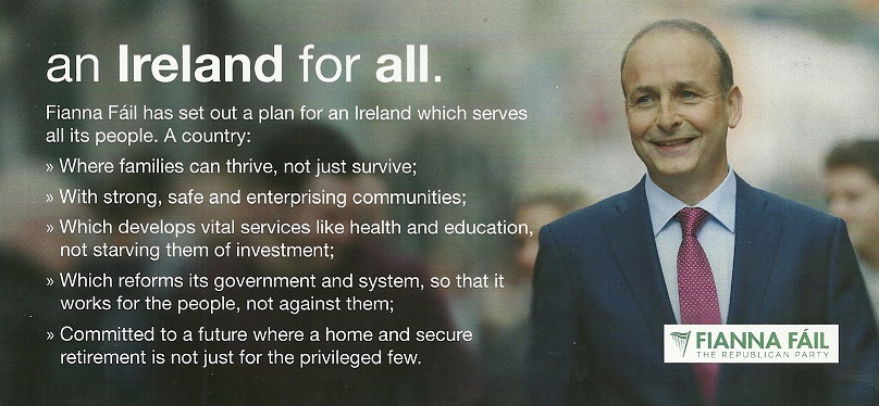 “an Ireland for all” leaflet from Fianna Fail giving an indication of their different priorities to Fine Gael.