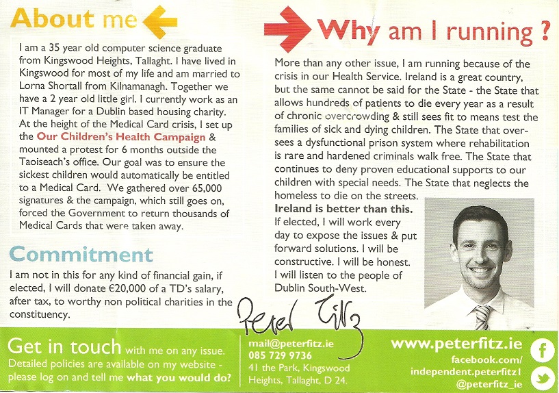 A leaflet from Peter Fitzpatrick who is running as an Independent in Dublin South West